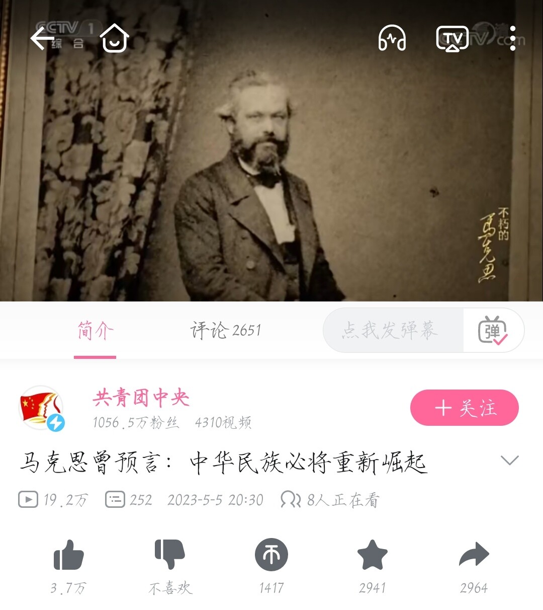 2023年5月5日,是我们伟大的导师—卡尔·马克思同志诞辰205周年,河蟹自然不会放过这个给自己镀金的机会,在5月5日,发布了一个视频,标题是“马克思曾经预言,中华民族必将崛起”,只谈民族而不谈阶级,看得出河蟹想借马克思诞辰大肆宣传极端民族主义,不出所望,评论区依旧翻车了,网友表示“全世界无产者联合起来”“马克思:6”“这样宣传mzzy(即民族主义)真的好吗?”,狠狠地打了河蟹的脸。