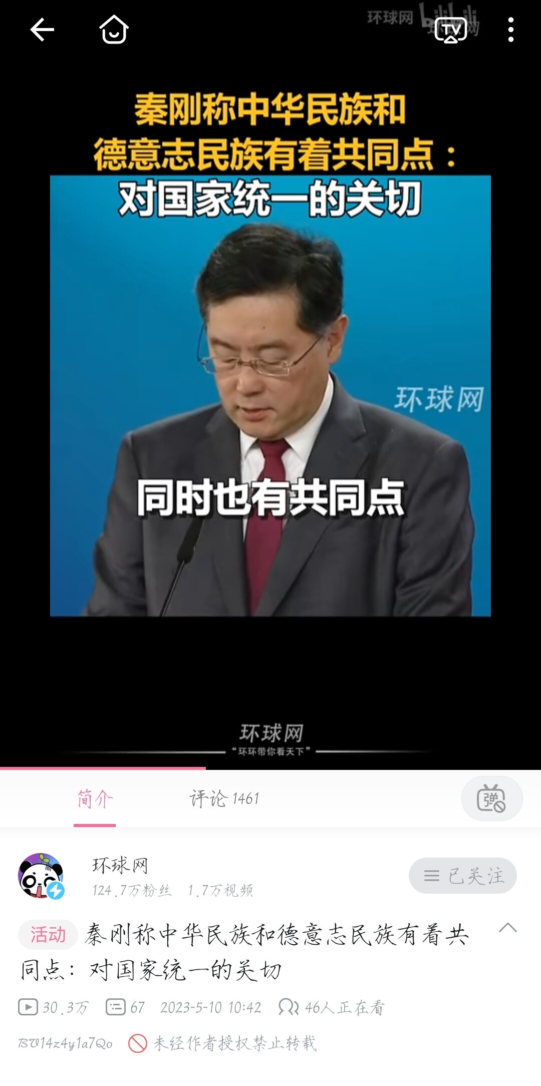 随之而来的,5月10日,环球网发布视频,标题为“秦刚称中华民族与德意志民族有着共同点:对国家统一的关切”,该言论并没有说明特指德二还是德三,但是作为官方媒体,不把话说明白,明显有着散布民族主义和种族主义的目的,而评论区则是无脑爱国者的狂欢,人人口里说的都是统一,但是却不知道统一的目的,都说解放,却不知解放指的是无产阶级解放无产阶级,而“留岛不留人”这种话竟能说出口,实在令人唏嘘,曾经解放全人类的理想已经被河蟹渲染成民族复兴。