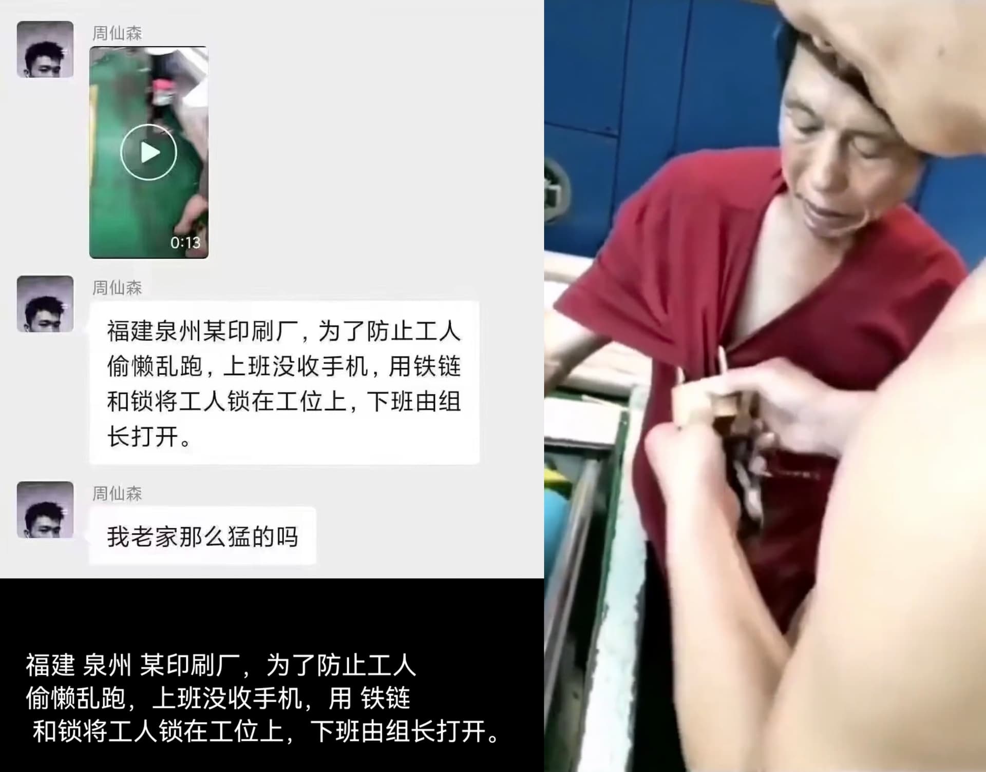 8月12日,据网传信息称,福建泉州某印刷厂,为了防止工人偷懒乱跑,上班没收手机,还用铁链和锁将工人锁在工位上,下班再由组长打开。