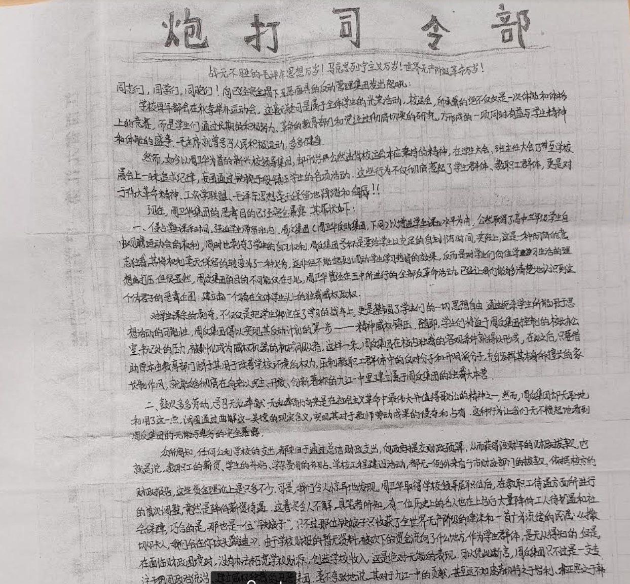 - 官僚资产阶级看到大字报,听到《炮打司令部》就像得了PTSD一般,文章全文没有提到压迫背后真正的凶手是谁,凶手却迫不及待的自己跳了出来,印证了他们心底的声音“到底有没有压迫,我还不清楚吗”。当年轻一代都认清了反动政府的真正面目,革命的未来大有希望。
