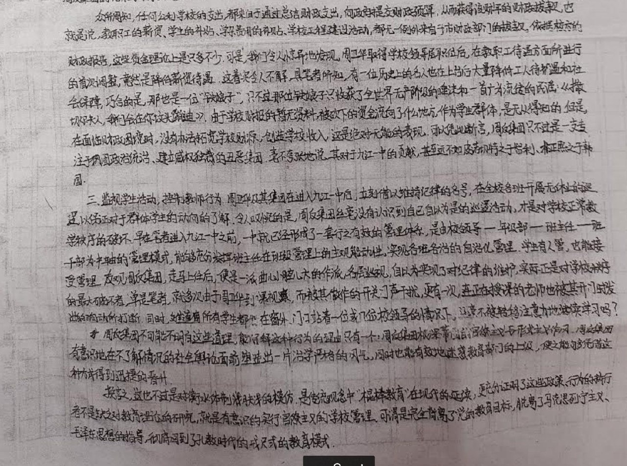 综合全文,其实可以看出同志是往轻了的写的,笔者猜测是有出于自身安全考虑,所以并没有把矛头指向特色党中央。讽刺的是,只是这么一篇正常表达诉求批评学校的文章,居然就出动警察了,不禁感叹修正主义叛徒是多么地害怕人民。曾有一位伟人1966年写下的大字报,到了今天依然让反动派感到惶恐不安啊。