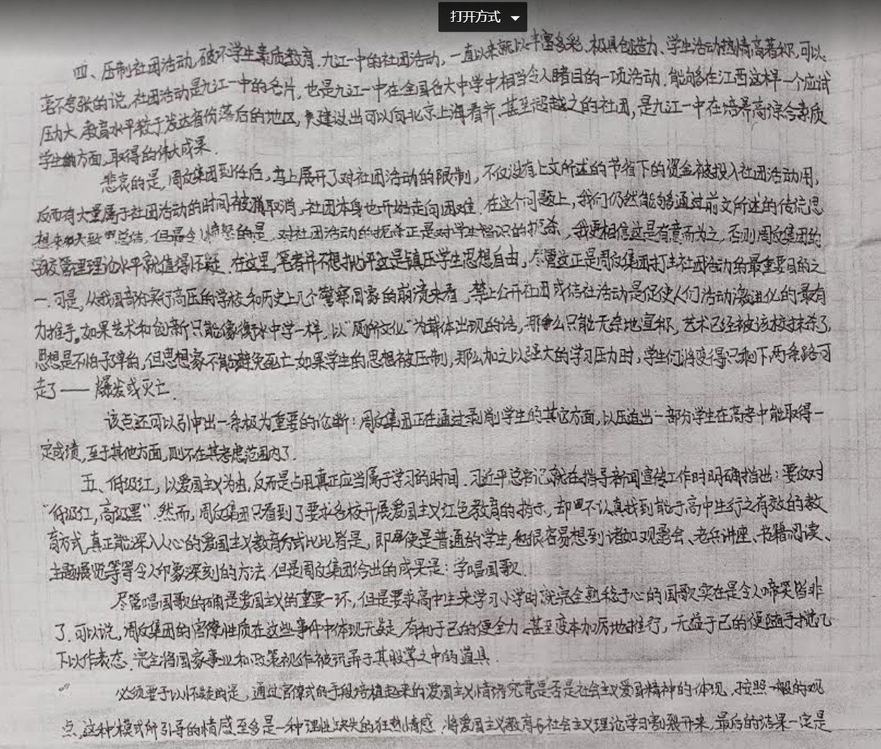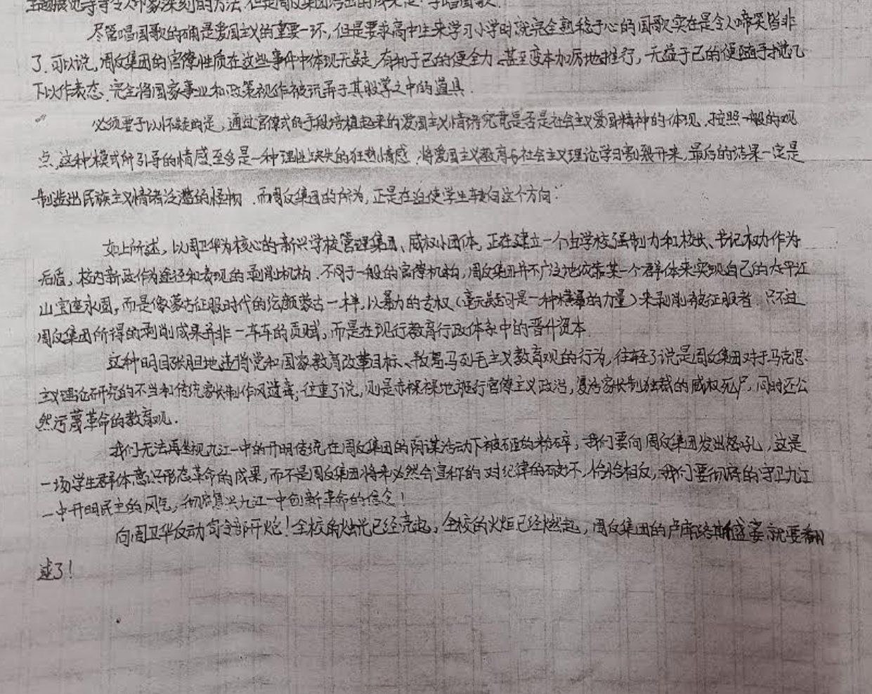 九江一中学生同志勇于斗争的精神值得我们敬佩,但我们也要尽可能避免这种冲塔式的行为,特色政权目前还广泛地掌握着主动权。写文章的学生同志目前下落不明,这是反动势力互相勾结倒行逆施的结果。