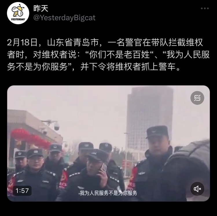 2月18日,山东省青岛市,一名警官在带队拦截维权者时,对维权者说:“你们不是老百姓“、“我为人民服务不是为你服务”,并下令将维权者抓上警车。