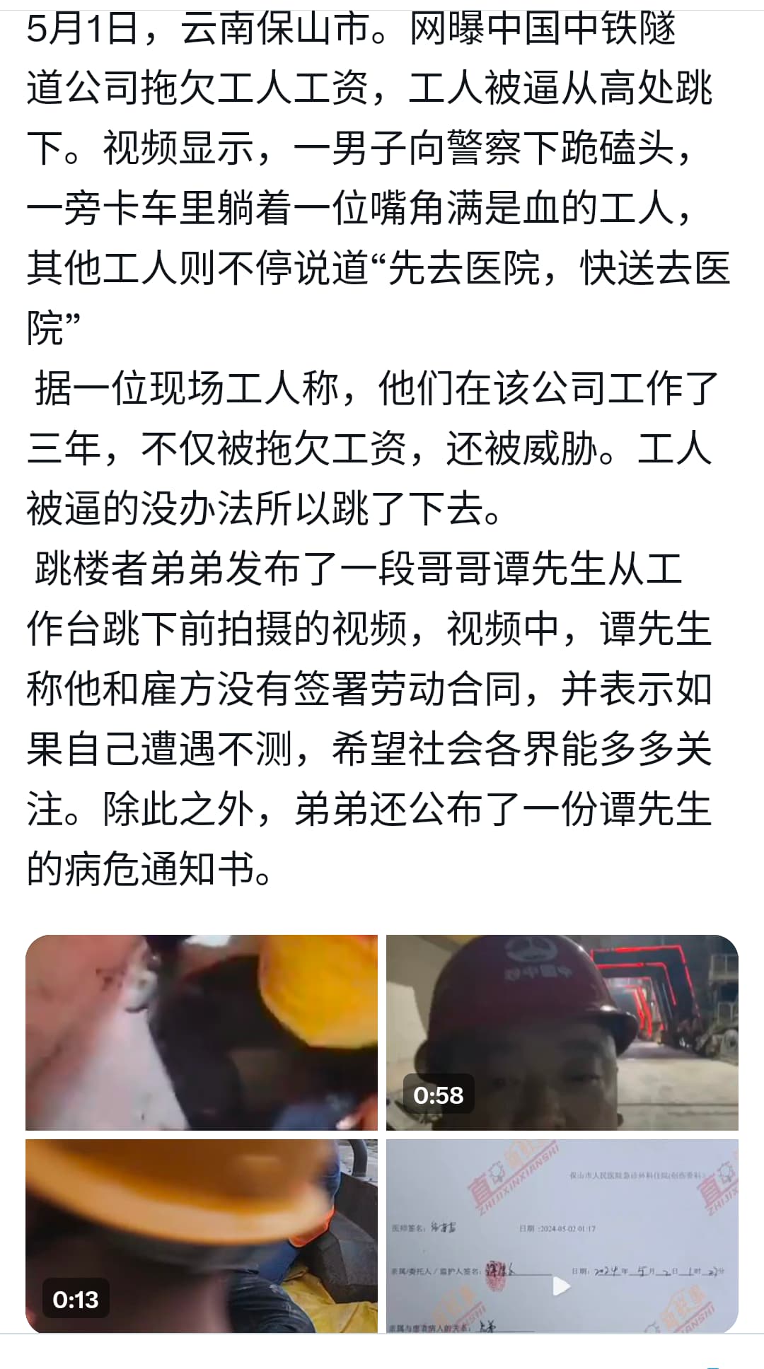 哪怕是在劳动条件“有所提升”的现在,工人们也还是会被资本家们“善意欠薪”。5月2日,一名云南的铁路工人因为被欠薪三年向老板“恶意讨薪”无果后,愤然从高处跳下,最后还是工友们向警察下跪磕头,那名工人才被勉强送去医院抢救。现在那名铁路工人已经病危,请问资产阶级官僚政府的寄生虫们,你们谁又能替这名工人发声、保障好无产阶级的薪资待遇呢?!这名工人危在旦夕,你们又靠什么保障人民群众的健康生活呢?