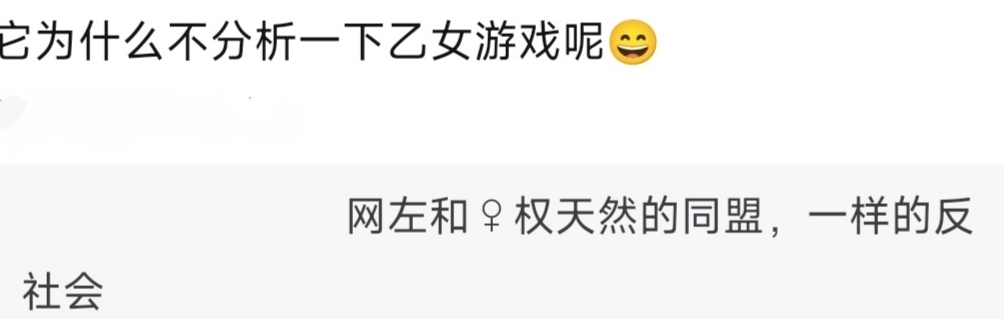 可能《二游形象》发到微博评论区会不一样,但估计大多是女拳与女权主义的论调,也就是说,他们可能只会认同女性被剥削,但只会认同被男性剥削,而忽略实质,只会强调家庭劳动,而忽略女性的社会劳动。我们也反对大男子主义与绅士主义,无论如何,当男性被一性骂道你连一个女人(娘们)都不如时,许多男性是会感到由衷的侮辱,这便是社会环境的影响