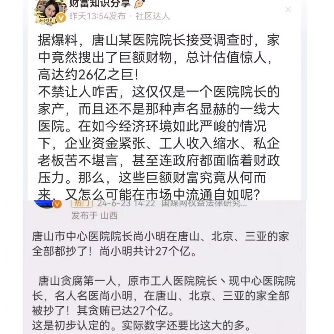 据河北省纪委网站6月20日消息:唐山市工人医院原党委书记,院长尚小明涉嫌严重违纪违法,经省纪委监委指定管辖,目前正接受保定市纪委监委纪律审查和监察调查。初步认定贪污数额已达27个亿。