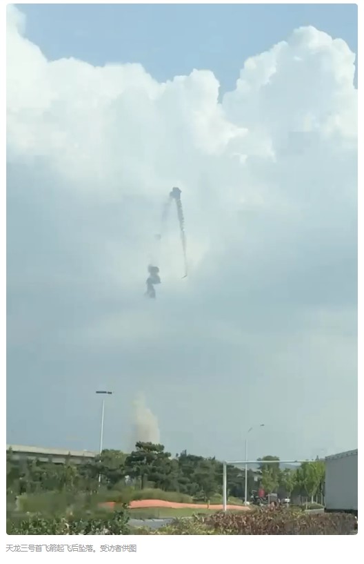 6月30日北京天兵科技有限公司在河南巩义市综合试验中心开展火箭一子级九机并联动力系统热试车,过程中一子级火箭脱离发射台升空,随后跌落在距离试车台西南1.5公里的深山中。在传播的视频中“天龙三号”发射后约20秒即熄火,火箭以近乎水平的姿态落向地面,落地后产生剧烈爆炸。