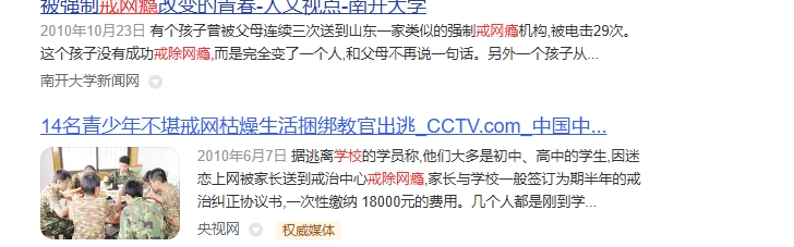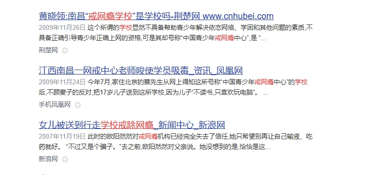 在杨永信事件和豫章书院曝光后,一时间,互联网上大片舆论声讨这类学校,但在热度过去后豫章书院关闭了,而类似豫章书院的特训学校仍然层出不穷。现如今,你只要在百度上搜索“戒网瘾”和“特训学校”这两个关键词就能出现大量的相关学校的广告,数量繁多让人不禁去想这背后有多少青年人在这些学校里面遭受虐待和压迫。而在百度贴吧的“特训学校吧”和“戒网瘾学校吧”中,大量受害者们在里面分享着他们收到的残酷虐待,控诉着这些血肉磨坊和吃人的加工厂。更令人愤怒的是,笔者在这些受害者聚集的贴吧中还被推荐一则特训学校的广告。资本家唯利是图的嘴脸淋漓尽致。这些贴吧不被推送流量,也不受大众关注,官僚资产阶级在言论控制上防止豫章书院曝光事件的再次发生。