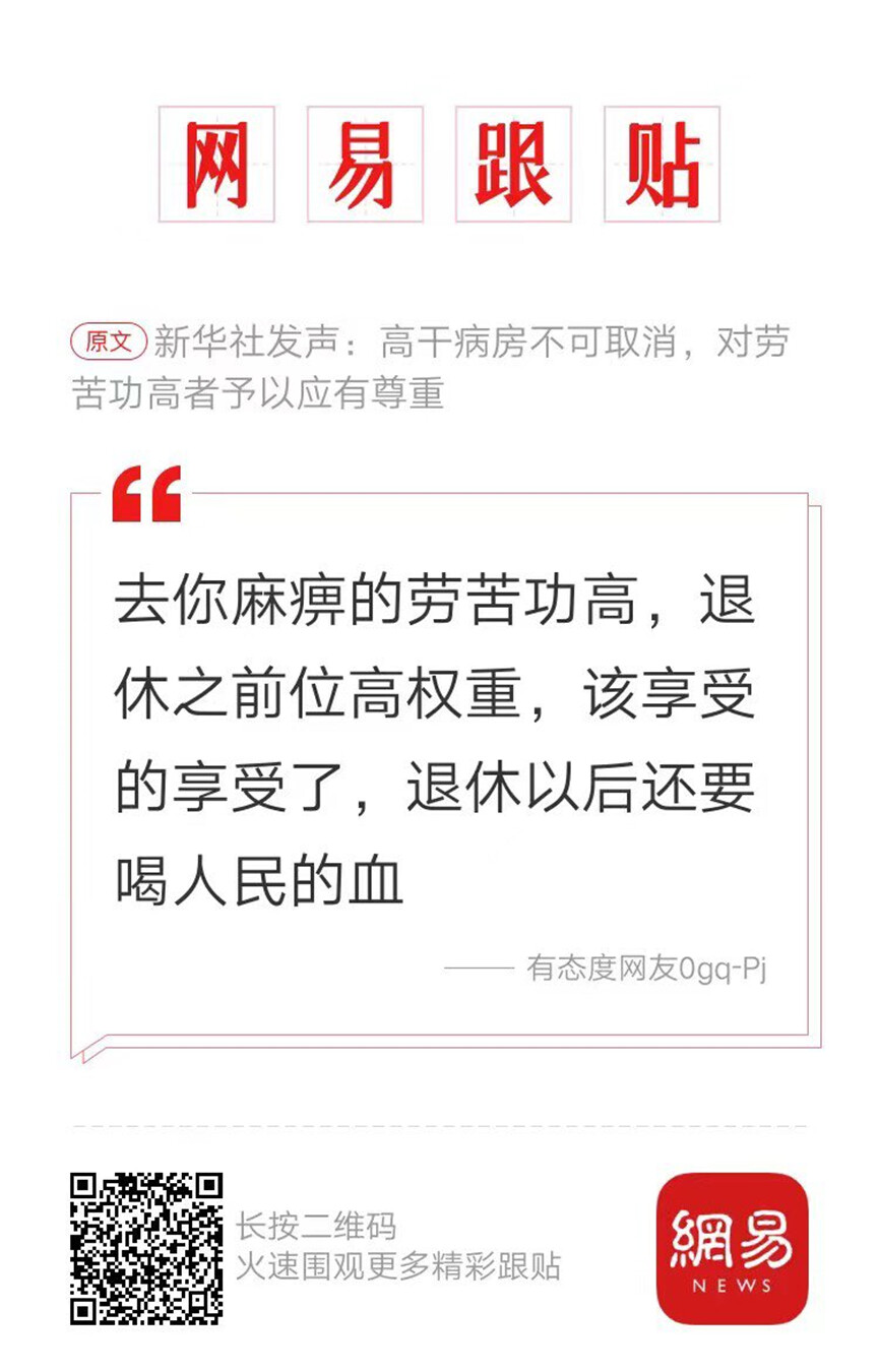 中共党校教授蔡霞发也转发了网易的文章,推文批评说,“这种特权高干病房,不仅每天消耗巨额资金,而且成高干家人用高干榨取民众血汗纳税钱的工具。我知道高干躺在医院里只要维持有口气,即便是脑死亡,家属不许拔管,高干每月的高额离休养老金、各种补贴、高干住房待遇,勤杂工、警卫战士(相当级别的是警卫班)都不能撤,实际上是撑著有口气养活一大家”。就比如之前的新闻:上海市高级法院前中共书记范祖祥,在上海瑞金医院ICU病房一住就是4年,花费巨额公众资金的消息引发怒潮。据悉范祖祥是上海人,曾经担任上海高院书记,级别应该是正厅级,他在2016年73岁生日那天,因脑梗塞被送到了上海瑞金医院,当时医生为他做了开颅手术。由于脑部损伤比较严重,范祖祥醒来后便不能说话和行动,一下子就陷入生活无法自理的状态,如同植物人。他需要呆在ICU那小小的空间,24小时不间断地依靠机械,才能勉强维持生命的持续。她的家人将他放在ICU一放就是四年,直到2020年其因为多器官衰竭去世。该消息引发怒潮,不少网民直指“都是纳税人的钱” ,“按照平均每天5万来算, 光是抢救他一个人就花了近亿人民币”,“这位领导花费全是纳税人的钱。如同植物人一住四年多?免费医疗就供养这些东西?”“全国还有多少这样中共老殭尸?”