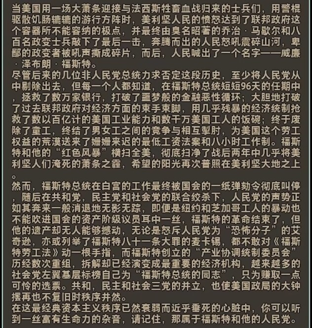 修正主义议会斗争和改良主义最喜欢的一集,一个社会主义政党在美国获得了一个任期,在这个任期的总统福斯特短短三个月动员起整个合众国的官僚把国家机器飙到最快,签署了无数条行政命令,通过了每一条救济法案挽救万家银行,完美实行八小时工作制 和最低工资,废除童工,重拳出击大资本 。孱弱的驴象两党虽然推翻了福斯特但是没人敢动福斯特的法案。搞笑的是能让国会推行这些法案却解决不了国会对他的弹劾,这么一个解决几千万人就业问题,解决经济危机的人被国会说弹劾就弹劾了。跟托派一样,在小资眼里上层建筑如同万能法宝,议会斗争也是一条道路,没有意识到任何制度都是由人来执行的,资产阶级老爷可不会在议会跟你和和气气的谈论,该重拳出击的时候不会有任何犹豫。