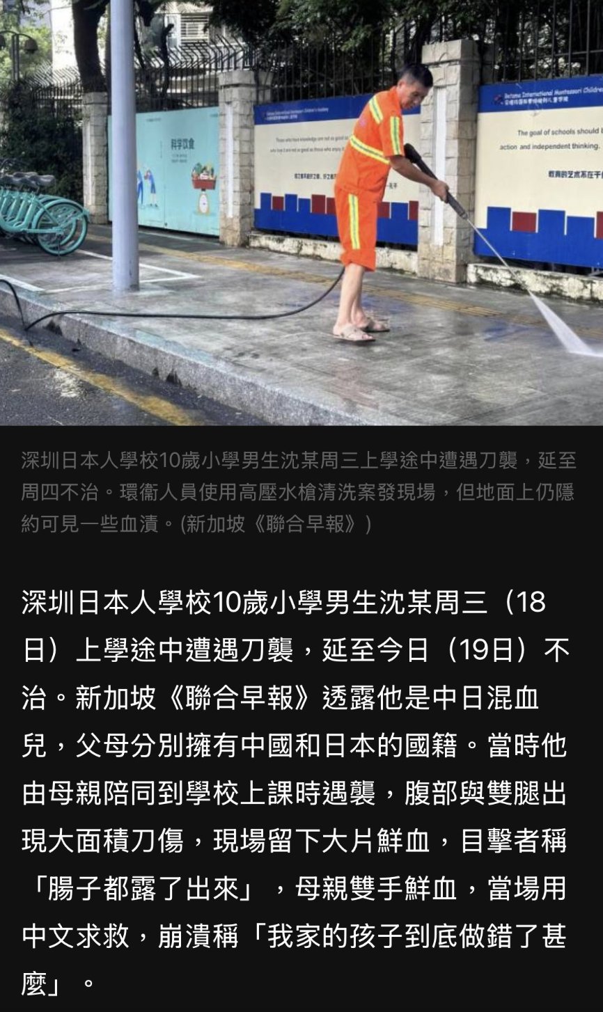 九月十八日,一男子于深圳日本人学校附近刺伤了正在一名上下学的外籍儿童,目前该儿童已在次日临晨伤重不治。