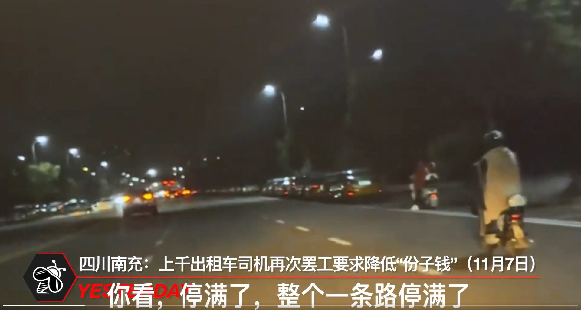 11月7日,四川南充的上千名出租车司机,再次发起罢工,要求公司降低“份子钱”。本月2至5日,四川南充的出租车司机们曾发起过为期四天的罢工行动,要求公司降低“份子钱”,据司机透露,他们每天需向公司缴纳200多元的费用,这比成都、重庆等大城市还要高,导致他们难以维持生计。5日,在公司答应降低“份子钱”后,司机们恢复了营运。然而,11月7日,司机们收到通知,他们的规费只降了仅仅30元,出租车公司的这一举动,立刻激怒了所有出租车司机,他们再次发起了罢工,聚集在南充嘉陵区书房大道,要求出租车公司给他们一个说法。截至当天深夜,出租车司机的罢工行动仍在持续。