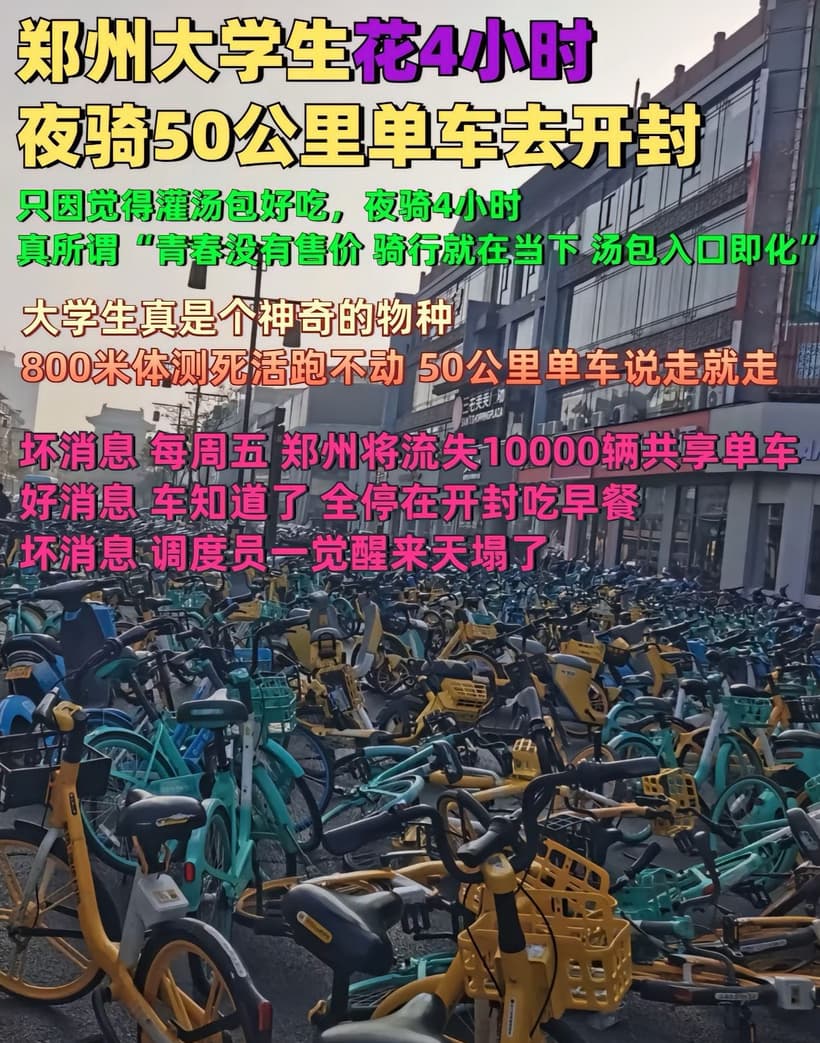 从11月2日起,河南郑州多所高校掀起了一股“夜袭开封”的热潮,共享单车淹没了公路与街道。“青春没有售价,夜袭开封拿下”“青春没有售价,疯狂就在当下”,大学生们肆意展露着自己的“青春活力”,这是忘却了毕业后将面临的就业与工作压力,还是看清未来后主动选择了放纵?没人知道。