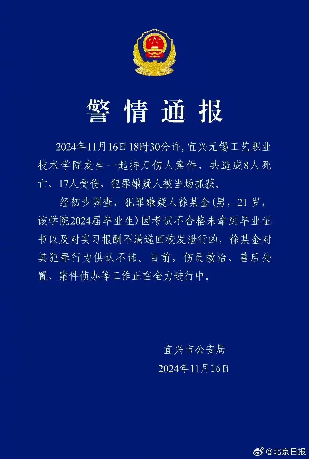 就在11月16日晚18:30作左右,21岁男子徐某金持刀在学院内针对学生进行无差别袭击,造成了8死17伤。