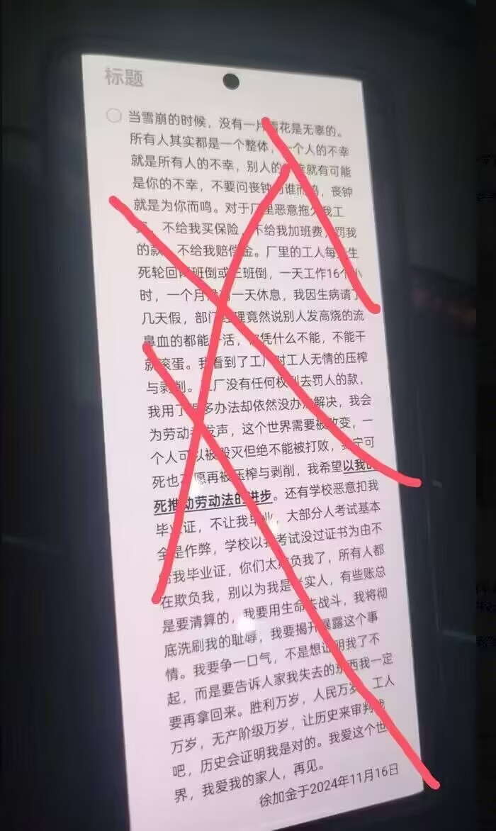 从这个遗书的内容来看,徐加金的作案动机并不是考试不合格,而是在厂内受到的高压剥削。是工厂的高强度压榨和工厂管理人员的非人处理导致徐某作案。