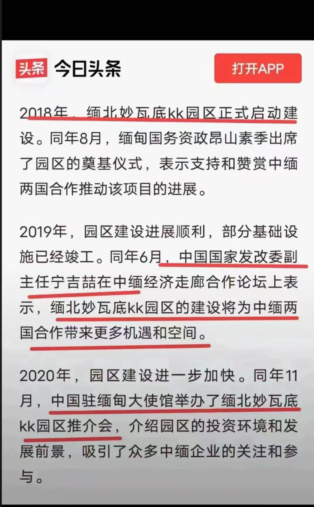 中国国家发改委副主任宁吉喆在中缅经济走廊合作论坛上表示,缅北妙瓦底KK园区的建设将为中缅两国合作带来更多机遇和空间。可见从建立之初就得到了中共的非常多的支持;包括中国的大型的央字头的国企集团、还有中国的部级以上的很多官员机构,全部都参与到了支持这个园区的建设。