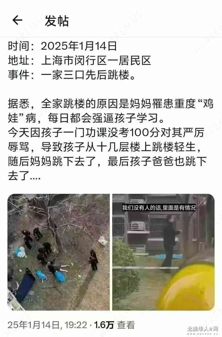 2025年1月14日,中修上海市闵行区一居民区,一家三口先后跳楼。据悉,全家跳楼的原因是妈妈罹患重度“鸡娃”病,每日都会强逼自己五年级的孩子学习。今天因孩子一门功课没考100分对其严厉辱骂“考不好,学校毕业后找不到工作,还不如去死”,在巨大的压力和指责下,小女孩情绪崩溃从十几层楼上跳楼轻生,妈妈瞬间情绪失控也跳了下去了,最后孩子爸爸目睹这一切后,也陷入绝望“这日子没法过了”也跳下去了。