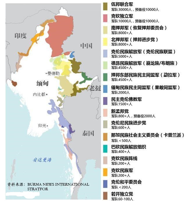 缅甸现在还在战乱中,300万缅甸人民流离失所,每年因为踩到地雷死亡或残疾的人数也在世界最高位。现在各个地方的少数民族武装形成多个割据政权,并同政府军形成对峙的局面。即使是因为军政府推行大缅族主义而高人一等的缅族,也越来越多地同少数民族一起加入到反对政府军的的行列中。但是代表全国的反政府军组织——民族团结政府,仍然是奉行过去的昂山素季买办政策,只是在中修和其它帝国主义国家中寻找出价高的。至于少数民族武装,仍然是军阀买办,有的倾向于军政府,有的则实际经营诈骗园区、贩卖罂粟等毒品;因此这些少数民族武装对于缅甸的民族资产阶级发展来说并不具有进步性。