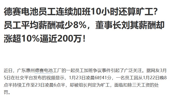 2025年3月德赛电池惠州工厂员工在网络发布视频称,其按8小时工作制正常打卡下班时,遭领班以"未完成10小时在岗"为由抹除考勤,并倒扣3天工资。工厂规定周日需义务加班,但不能打卡。此举明显是在规避劳动法,并且临时工加班费也被拖欠。视频被小光在网络曝光后,疑似公司人员致电威胁该员工删视频,甚至人肉其亲属隐私信息,公开曝光并骚扰。