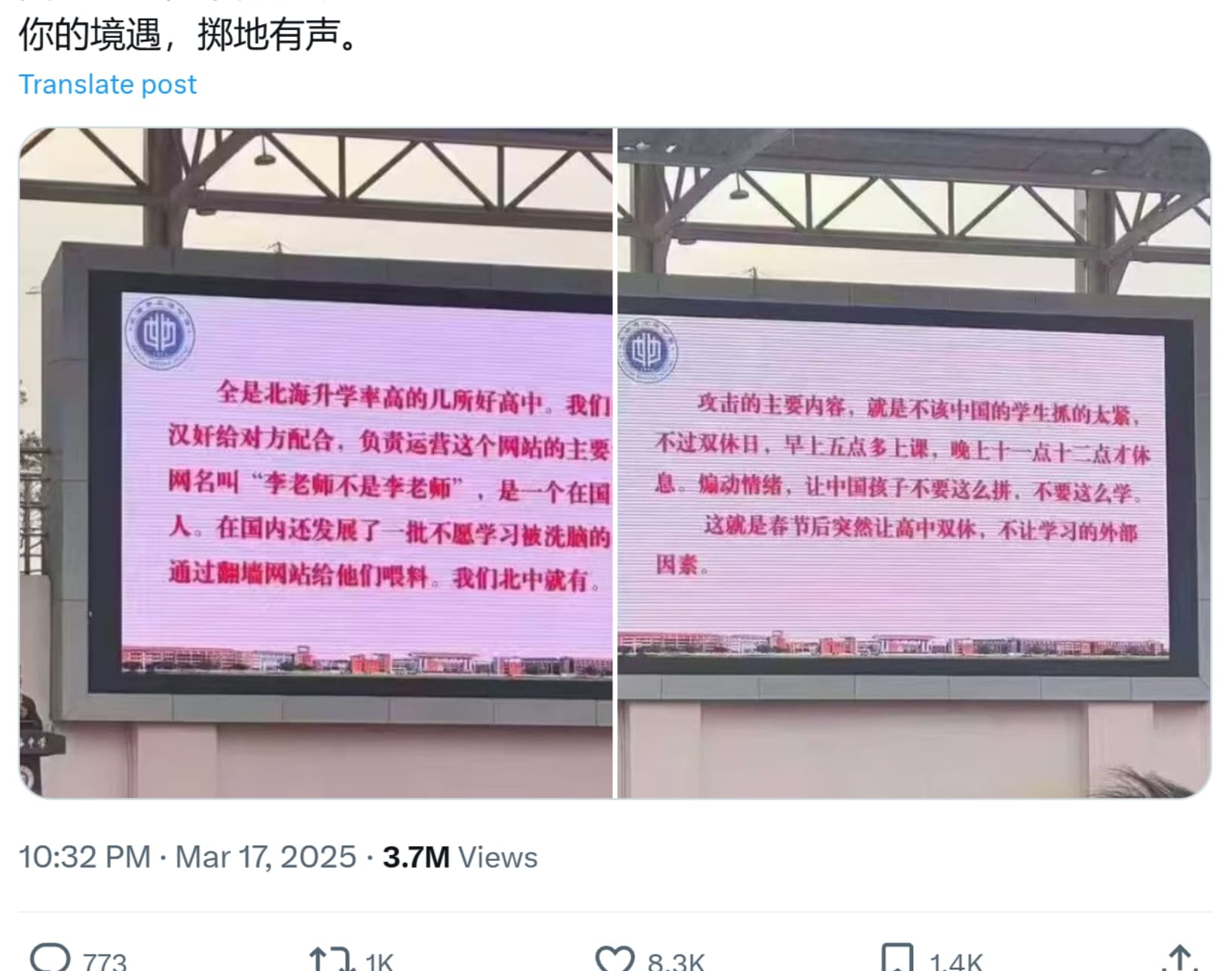 上周末,在广西北海中学家长会上,北海中学校长王建刚称,李老师不是你老师 的611Study项目是导致春节后突然全国高中双休的外部因素。并指责勇于发声的学生是“小汉奸”。在此,李老师与 $LI 团队正式声明,要求王建刚校长就针对学生的污名化行为道歉。学生揭露超时学习问题,是正义之举,而非“汉奸”行为,北海中学的611学时严重违反了国家相关规定,对学生的身心健康造成严重影响。在这样的背景下,学生勇敢地向外界揭露问题,是在捍卫自己的合法权利,是在为整个学生群体争取更合理的学习环境。污名化学生是典型的“敌我化”操弄,制造恐惧以掩盖问题,当学校管理层无法正面回应学生的合理诉求时,他们选择的手段不是解决问题,而是利用民族主义情绪,将学生污名化为“汉奸”。这样的手段在历史上屡见不鲜,从“反右运动”到“文革”,凡是敢于提出批评、争取权利的人,都被污蔑为“叛徒”、“特务”。而今天,一个校长居然也在复刻这样的恶劣传统,把学生合理的申诉说成是“卖国”,这无疑是在践踏教育的基本价值。一个国家的未来靠的是拥有独立思考能力、敢于争取公平的年轻人,而不是一群被恐惧驯服、只会唯命是从的顺民。如果一个校长连“让学生遵守合理学习时间”的基本诉求都不能接受,反而要对学生扣上“汉奸”的帽子,那么这个校长才是真正的问题所在。真正危害国家的,是那些滥用权力、漠视学生权益的人。是他们在压制年轻人的独立人格,是他们在把教育变成控制的工具,而不是培养人才的摇篮。一个真正有自信的国家,应该鼓励学生提出问题,而不是让他们在恐惧中噤声。我们郑重要求王建刚校长,就其污名化敢于发声的学生的行为进行道歉。如果不然,我们将于3月19日开始,陆续披露我们已经掌握的关于王建刚在任期间的种种恶行。我们也欢迎社会各界人士向我们提供更多相关信息。面对压迫,不再沉默,你的境遇,掷地有声。