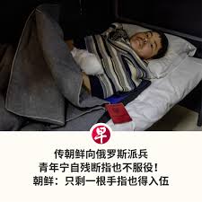 就在1个月前,朝鲜内部流出向俄罗斯派兵的消息时,民众逃避兵役的情绪日益高涨,许多朝鲜家庭十分恐惧独生子将被送往前线。部分朝鲜青年为逃避征兵甚至采取了自残截断双手食指等极端措施。以往只有右手食指完好者才被视为具备扣动火器的能力,从而成为入伍基本条件。但是该事件一发生,朝修当局立刻更改指示,命令“即使只剩一根手指也必须入伍”。征兵条件被调整,即使仅保留部分手指,也必须服役。