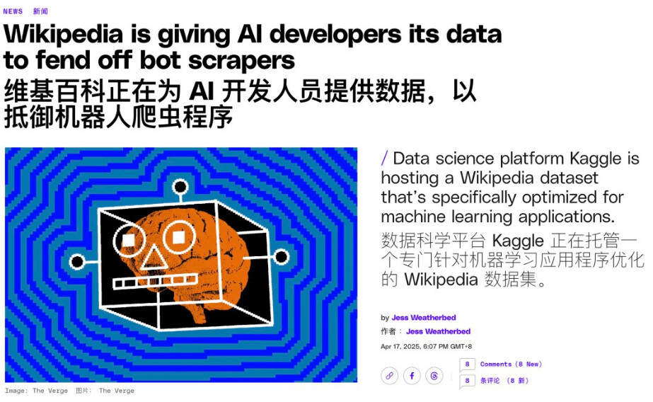 笔者在阅读相关文章时注意到一个非常有意思的点,即互联网存在有一个机器人协议叫做robot.txt,如果网站控制者不想让 AI 爬虫访问自己的网站,可以把它写进协议里。曾经也有公司因为不遵守而吃到了官司。可是,为什么维基百科没有选择去利用这样的看起来很有效的法律维权手段来维护自己的权益,去告那些侵害了维基的权益的AI公司,反而选择在一开始就投降ai公司?要知道,维基百科托管在社区平台上的内容,是需要维基百科的工作者们费心费神来把正常互联网页面转化为JSON 格式的结构化内容的,这样才能由于AI在查看时更容易读懂每一段的内容和数据,从而降低AI 公司的成本,才能达到避免ai爬虫大规模访问服务器的目的。维基百科如此折腾自己,都可以说是帮着ai公司在赚钱了,为何不通过法律途径解决问题?
