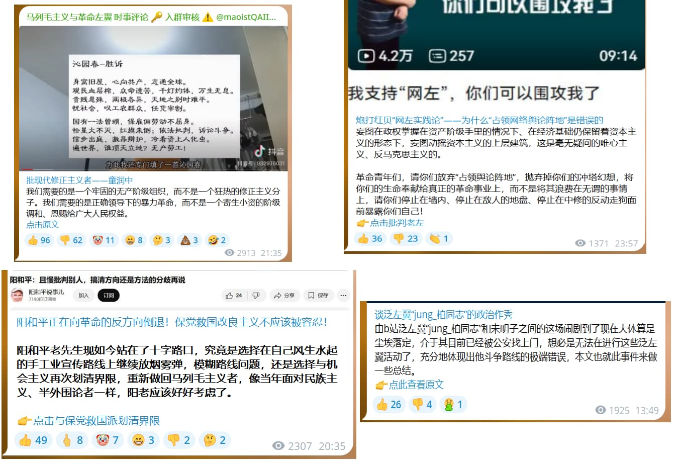 阳和平: 一开始一直做科普向的革命知识宣传,从未讲过路线,但始终淡化路线斗争,认为路线斗争是内部矛盾,可以通过摆事实讲道理来解决。在其发视频维护魏巍这个老左、刻意模糊路线斗争与方法之争时,大群对此做出批判 ,引起了机会主义者们的强烈不满与攻击。在其所属组织激流网暴出性丑闻事件之后,机会主义者们反对政治挂帅,开始“讲事实拿证据”,不顾一切地维护阳和平。其与中修走狗未明子无力斗争时,最终借助中修的力量,对未明子提出诉讼,上演了一场“反贼告官,被告是官府泥腿子”的闹剧。至此还没完,机会主义者们还要拿出列宁的《左派幼稚病》来说事,说合法斗争也要搞,还拿出马克思当年打官司的事情来做文章