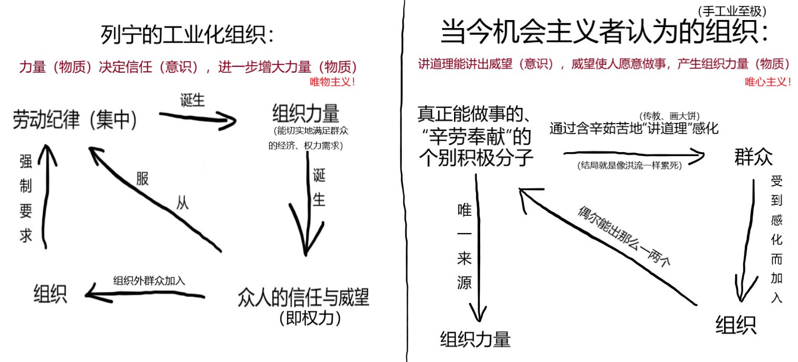 2、不论是“左”倾的机会主义,还是右倾的机会主义,从根本上来讲就是一点,就是看不到无产阶级蕴含的革命力量,看不到如何去组织发动起这个力量,于是乎或激进或保守,在错误的路线上一路狂奔。为什么看不到?因为机会主义者没有站在革命的立场上,他们往往是从小资产阶级,甚至是资产阶级的立场出发去看问题,自然七歪八扭,整的鸡犬不宁。