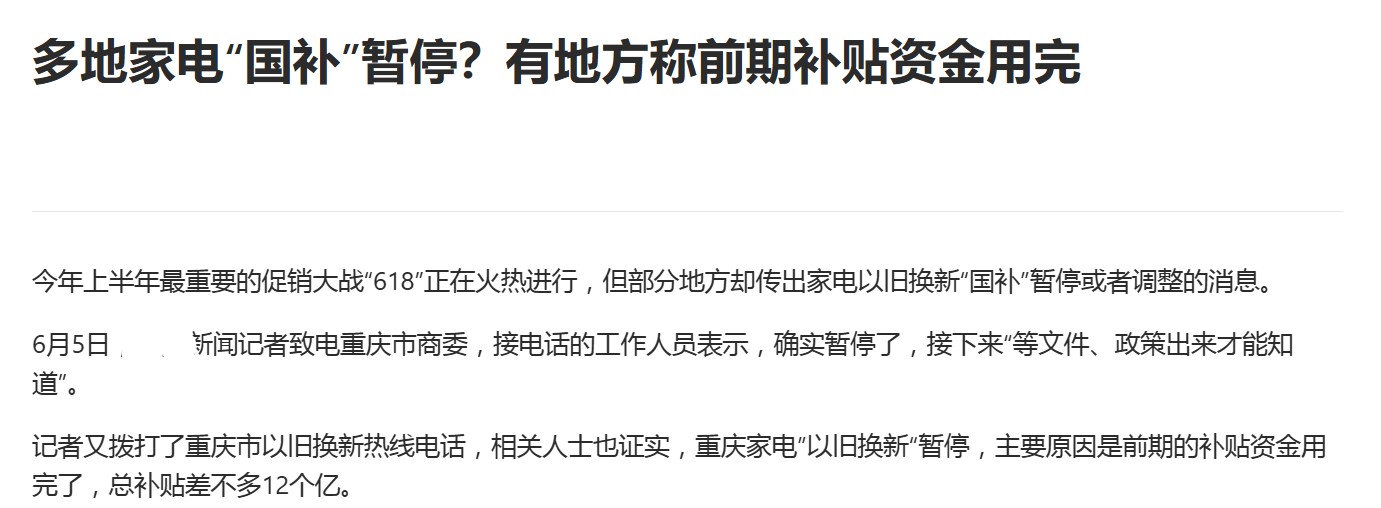 在最近的“消费节”618前,中修政府如重庆、江苏、广东等多地相继对家电“以旧换新”国家补贴政策进行所谓的优化调整。中修政府所说明的原因是并非是没钱补贴了,而是存在一些“异常的商业结构失衡”,所以中修政府才要暂停调整。那么事实是啥呢?就是中修的财政坚持不住了,不愿意投钱去“补贴”了。中修原本希望通过类似的补偿手段盘活市场,将国内的经济循环起来。但是无论是曾经的汽车还是别的什么补贴,似乎都达不到他们的既定目标。这实际上是个很耐人寻味的事情,在持续的资本主义危机中,钱是有的,但是资本是僵死的流通迟滞的。既然流通迟滞,那么资产阶级就无法将自己剥削的劳动价值进行较快的变现为资本(比如生产资料和一般等价物)。最终使得整个社会处于一种明明物质是饱和的但又是十分缺少的诡异状态(物质有但是流通不畅,需要物质的地方得不到物质。资本也无法从这些缺乏资本主义活动的环境中通过剥削无产阶级劳动的方式增加自己)因此中修政府才会进行“补贴”,他们就希望通过这样的方式刺激商品流通起来,从而达到盘活资本循环的目的。但是资本主义危机之所以叫做危机,就是因为资产阶级的方法是无法解决它的。“有钱不赚王八蛋”,从来就是资本增殖为第一位的大资本(大企业、有特权的官僚)通过自己的优势去截流这些“补贴”,使得中修政府的补贴流入这些大资本之中,越补贴,资本吃得越多,吃得越肥。这也是中修政府越进行补贴,越希望能够盘活资本主义市场,社会财富两极分化越严重的原因。