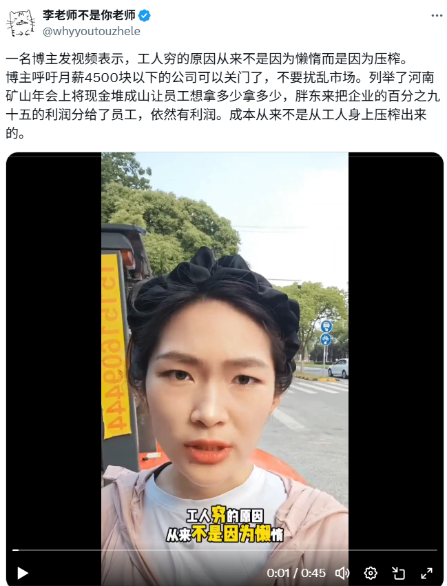 据推特自由派媒体李老师报道:一名博主发视频表示,工人穷的原因从来不是因为懒惰而是因为压榨。博主呼吁月薪4500块以下的公司可以关门了,不要扰乱市场。列举了河南矿山年会上将现金堆成山让员工想拿多少拿多少,胖东来把企业的百分之九十五的利润分给了员工,依然有利润。成本从来不是从工人身上压榨出来的。