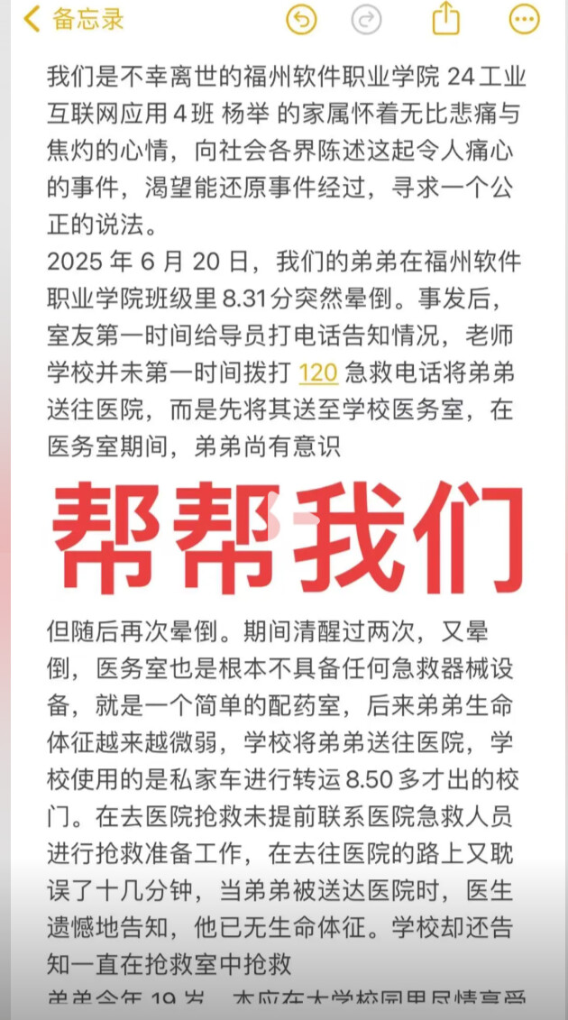 福建福州,“福州软件职业技术学院”的文武砂校区于6月23日发生了一起学生死亡事件,据称起因是食物中毒,家长在校门口举着遗像进行维权,现场有警察维护秩序。6月24日,同一校区再次出现食物中毒事件,救护车抵达学校。目前,该校区已实行戒严,学生被禁止出入。值得注意的是,数月前该校的文岭校区也曾发生学生在课堂上猝死的事件,同样引发了家长维权。面对接连不断的安全事故和“维权即封锁”的处理方式,越来越多网友质疑学校管理混乱、校方态度冷漠。