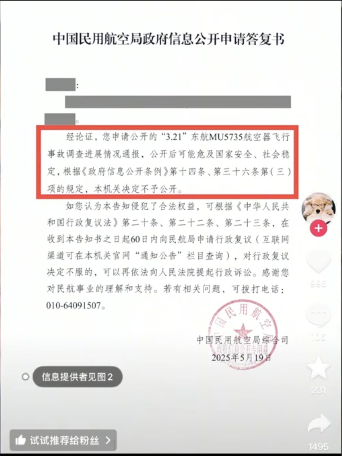 该答复书在网络上广为流传。不予公开,为什么不予公开?如果是波音客机的问题,会危害中修国家安全吗?如果是飞行员个人原因,会危害中修国家安全吗?