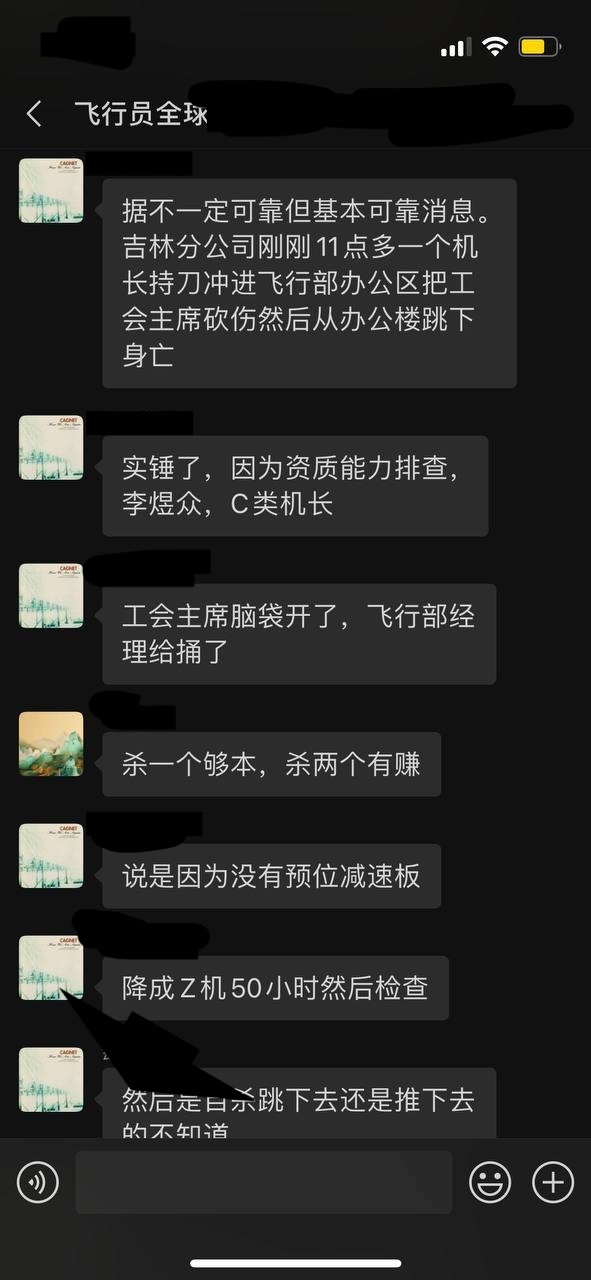 7月1日 南航吉林公司,多个渠道有网友甚至南航飞行员曝光或投稿,南航机长李煜众因受到不公平待遇,用刀捅了工会主席和飞行部经理后跳楼自尽。