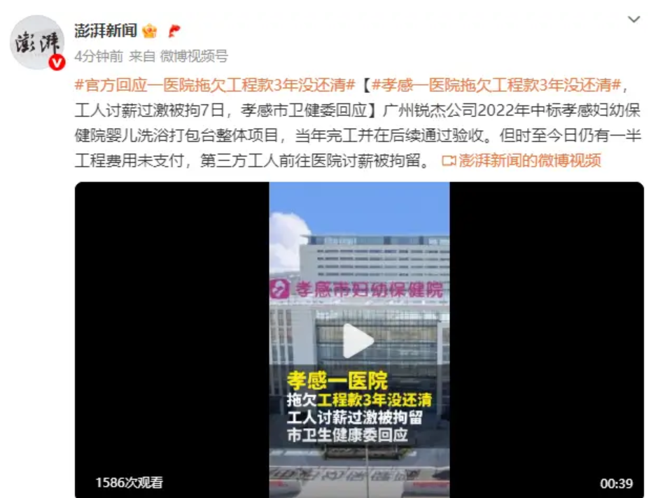 孝感一医院欠工程款三年没还清,第三方工人“讨薪”过激被拘留 ,该医院工程项目完工近三年,而劳务派遣公司,锐杰公司仍有一半工程款未收到,导致无法及时支付外包工人的费用。工人因长期未拿到工资,多次与公司沟通无果后,前往医院讨薪,因行为过激被警方以“扰乱单位秩序”为由行政拘留7日。 工人和医院之间没有直接经济合同关系,工人主要依赖公司收到工程款后才能获得报酬。 医院以专项资金未下拨为由拒绝支付剩余工程款,导致工人工资长期拖欠,影响其正常生活。