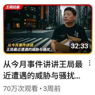 8月27日,知名旅日自由派调查记者王志安发布视频《从今月事件讲讲王局最近遭遇的威胁与骚扰》,讲述了自己与公司团队近日来在日本遭到的骚扰与人身安全方面的威胁。原来,中国国内有一位专门为法轮功学员提供法律援助的律师王全璋。2015年6月,他发表了一篇微博,称自己替当事人打官司,在出庭的时候遭到了二十几名法警的围殴,又配上了自己的“伤势”图片。可从照片看,他的“伤势”只有头上的几处刮痕。于是,当时同为意见领袖的王志安就回帖讽刺了王全璋,质疑其叙述的真实性,不少人表示赞同。王全璋因而对王志安怀恨在心。之后,王全璋遭到中修当局的抓捕而入狱。2020年出狱后,王全璋先是回到北京住处,后又来到日本。此时的他仍然衔恨于王志安在微博上对他的嘲讽,于是一方面向日本的法院起诉王志安,另一方面纠集了一伙人众,对王志安和他的公司团队进行开盒、网暴与人身威胁。