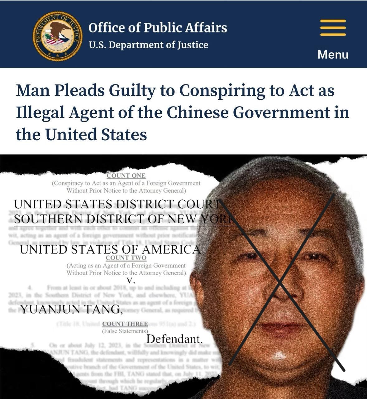 据资产阶级自由派媒体报道,9月16日,华裔美国公民、纽约皇后区法拉盛居民唐元隽承认其曾受中国国家安全部指示,在美国担任中国特工。