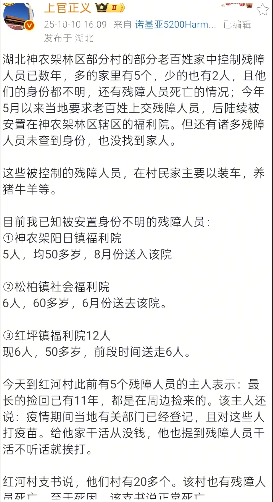 十月初,著名的民间打拐志愿者“上官正义”在抖音发布了一条视频,揭露湖北神农架有多个村的多户人家,一共控制了十多名残障人员。这些人控制残障人员长达数十年,期间这些残障人员一直被强迫劳动。
