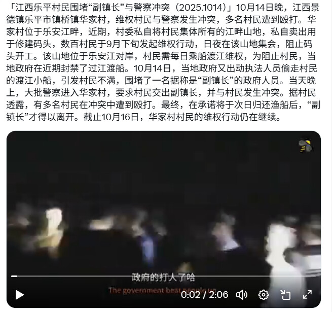 网友爆料10月14日晚,江西景德镇乐平市镇桥镇华家村,维权村民与警察发生冲突,多名村民遭到殴打。华家村位于位于乐安江畔,近期,村委私自将村民集体所以的江畔山地,私自卖出用于修建码头,数百名村民于9月下旬发起维权行动,日夜在该山地集会,阻止码头开工。该山地位于乐安将对岸,村民需每日乘船渡江维权,为阻止村民,当地政府在近期封禁了过江渡船。10月14日,当地政府又出动执法人员偷走村民的渡江小船,引发村民不满,围堵了一名据称是“副镇长”的政府人员。当天晚上,大批警察进入华家村,要求村民交出副镇长,并与村民发生冲突。据村民透露,有多名村民在冲突中遭到殴打。最终,在承诺将于次日归还渔船后,“副镇长”才得以离开。截止10月16日,华家村村民的维权行动仍在继续。