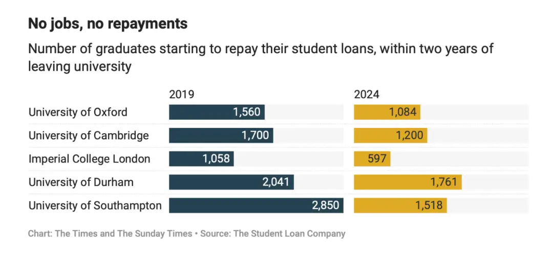 《泰晤士报》10月27日最新消息揭露了英国就业市场的残酷现状——2019年至2024年,罗素集团(Russell Group)旗下24所英国顶尖大学的毕业生在毕业两年内开始偿还学生贷款的人数从5.7万人降至4.5万人以下。这说明,毕业两年后能够获得28,470英镑年薪的人数显著减少。