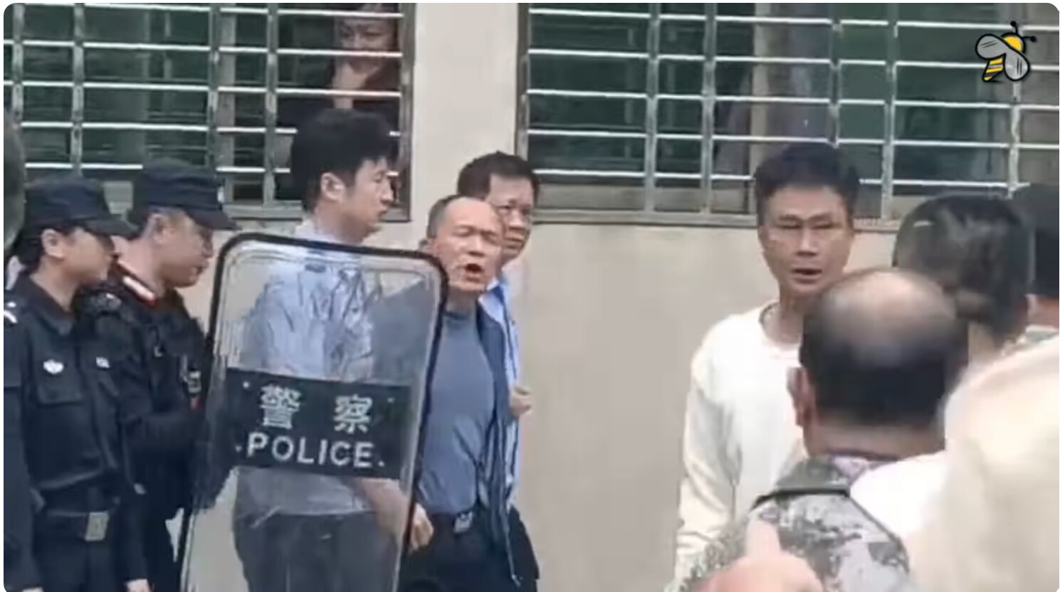 晚9点左右,中修匪警再次试图将盗伐人员带离现场时,又一次引发冲突,斗争群众再次朝匪警投掷矿泉水瓶、石块、凳子等杂物,匪警以防爆盾连成一片,撑起雨伞护送盗伐人员。现场群众的叫骂声、投掷擦出的风声、匪警无人机的喊话声,不绝于耳。