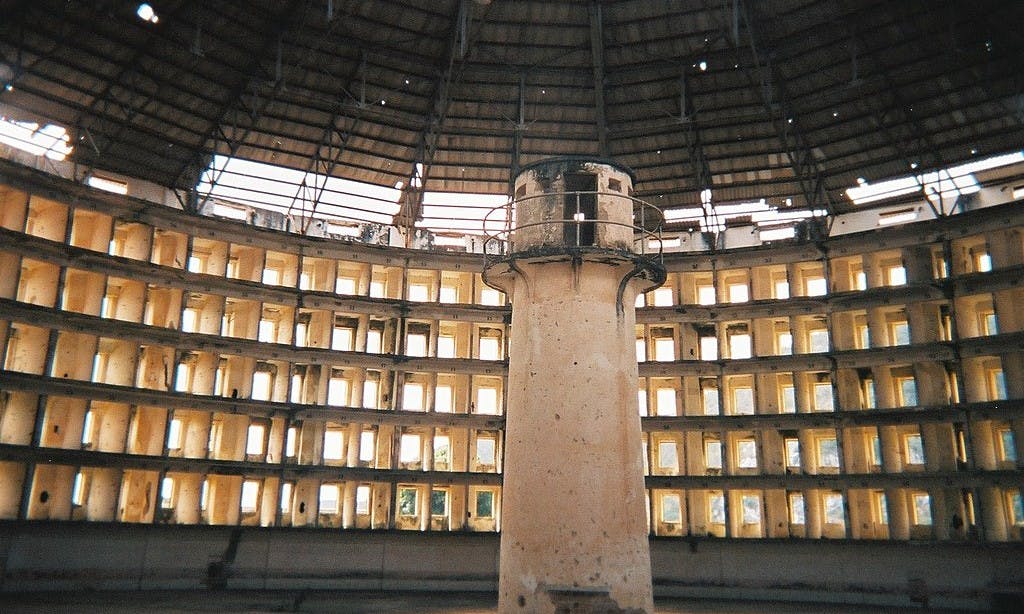 1785年,资产阶级哲学家边沁为了创造最便宜的监狱,便设计了圆形监狱建筑。这所监狱又一个圆形大厅组成,在周围建立一座高耸入云的高塔,将牢房安置在圆形大厅四周,把警卫安置在高塔上,警卫借助高塔可以看见每一个牢房,但在牢房里的囚犯却看不见在高塔里的警卫。当然警卫不可能同时监视所有的牢房,但是牢房中的犯人由于看不见在高塔中的警卫会认为自己时时刻刻处在监视中,便会放弃越狱想法,惶惶不可终日。哪怕到最后警卫离开高塔,囚犯们也不敢造次。