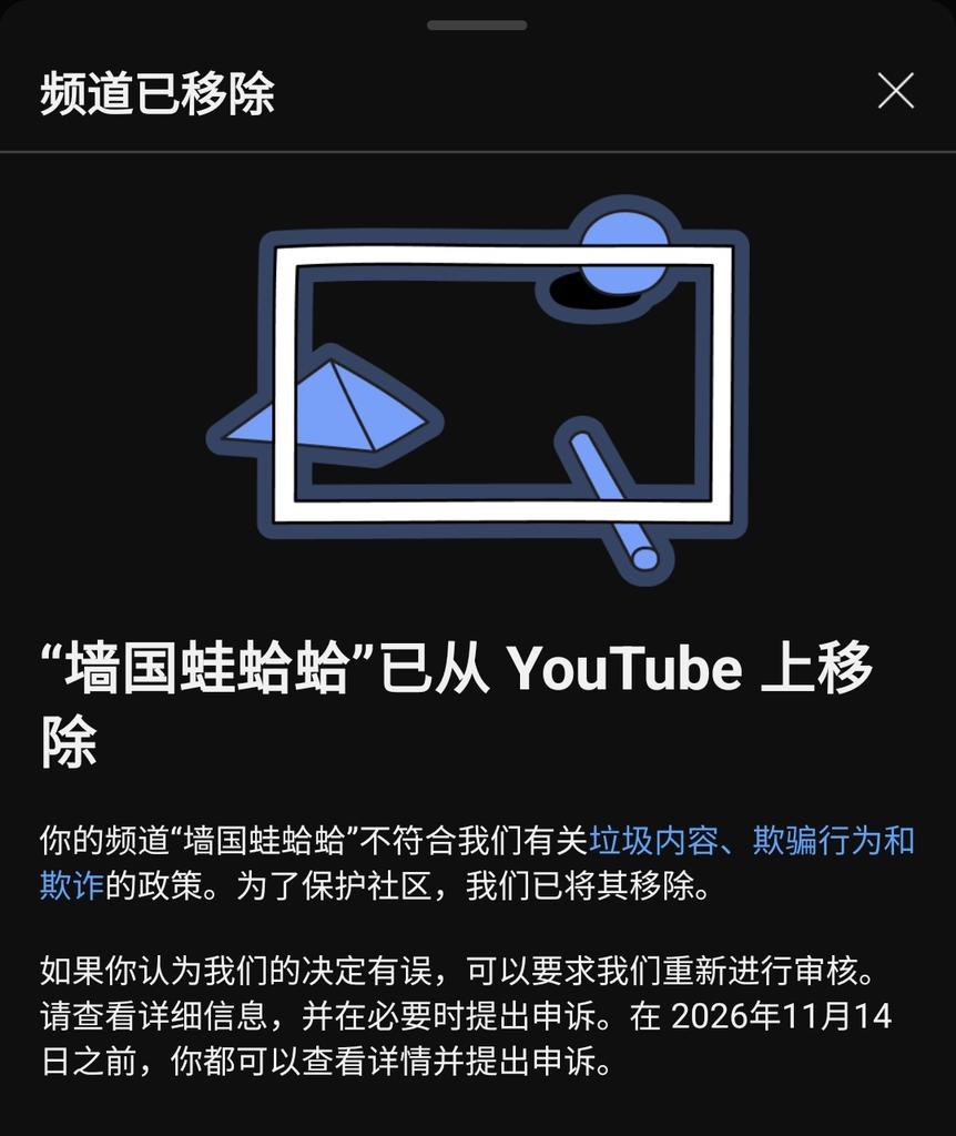 近期自由派的著名人物墙国蛙蛤蛤在youtube的频道被YouTube官方以不符合“垃圾内容、欺骗行为和欺诈”政策为由在没有提前警告的情况下直接移除,而墙国蛙蛤蛤本人则是对此提交申诉。而其在提交申诉后,YouTube官方声称“仔细审核了”我的频道,“确认其违反了”YouTube的“与垃圾内容、欺诈和欺骗行为有关的政策”,不再提供任何任何恢复我5年多前创建的墙国蛙蛤蛤频道的官方手段,并称墙国蛙蛤蛤无法再创建任何其他YouTube频道!