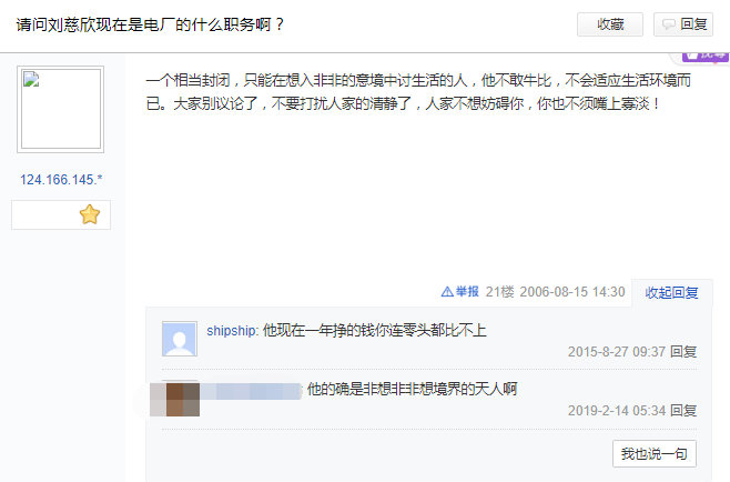 刘慈欣在娘子关发电站工作的时候,虽然并不是资产阶级,但也算是个小资产阶级了。因为生活在资本主义规则运作下的发电厂,刘慈欣是有很强的“追求个人成功”的观念的。而小说《三体》成功发布后,刘慈欣确实成功从小资产阶级一跃成为了资产阶级;便更不加遮掩地表达了自己的资产阶级世界观了。从刘慈欣那时候在贴吧的发言中,我们也得以一窥刘慈欣的反动立场: