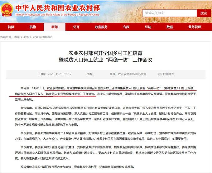 11月13日,农业农村部召开会议:防止因失业形成规模性返乡滞乡。