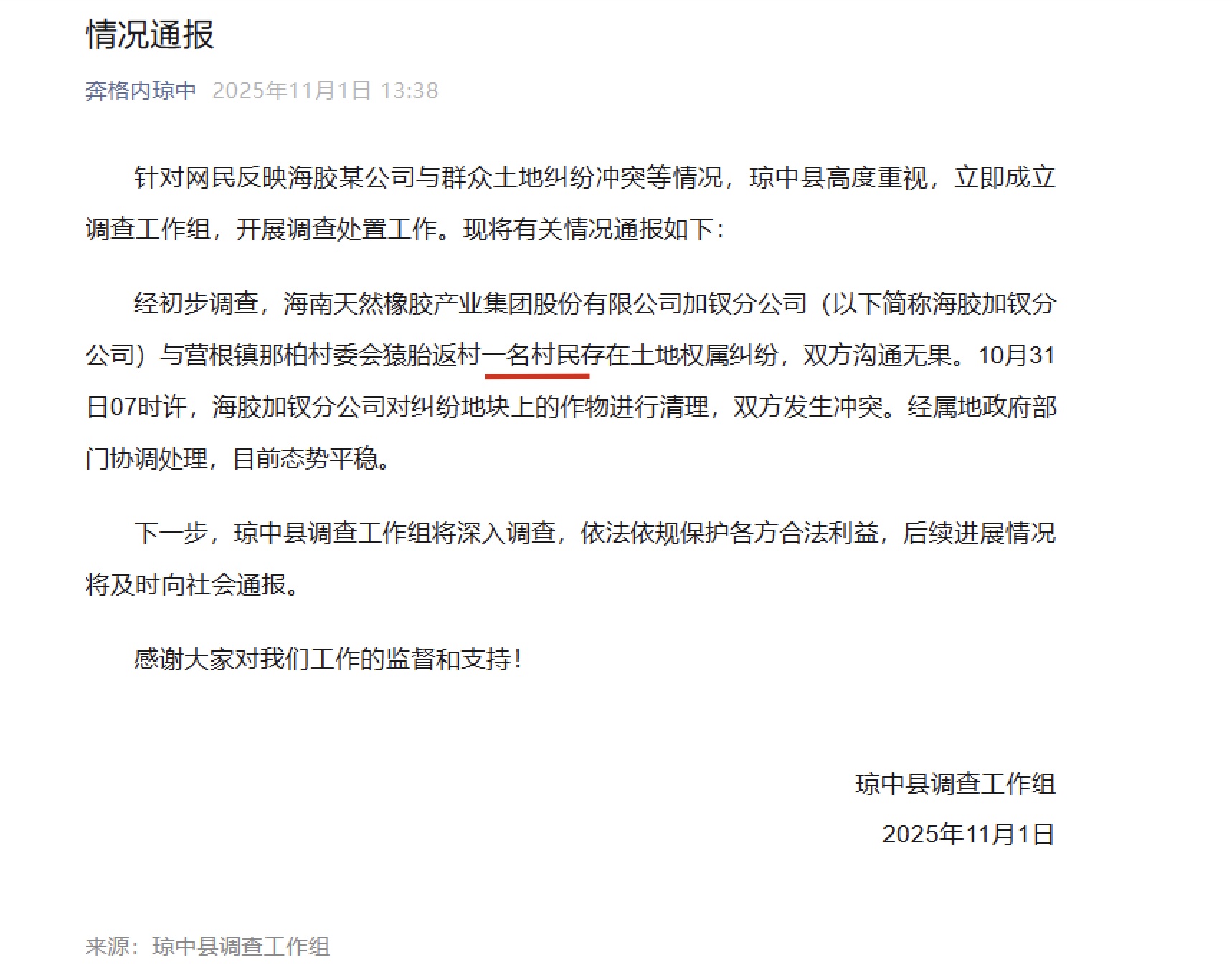 2025年10月31日,海南省琼中黎族苗族自治县上千村民发起“打倒海胶集团”的抗议行动,围堵海胶集团加茶农场,砸毁了多辆轿车及部分农场设施,一度与警察发生激烈冲突。另外,村民遭遇在海外引发共鸣,琼中各镇以及儋州、白沙、五指山等市县的一些年轻人纷纷驾车赶到加茶,声援抗争村民。据知情人士透露,11月1日,在当地政府的调解下,村民获得了58.86万元的赔偿以及10万元的复种资金。