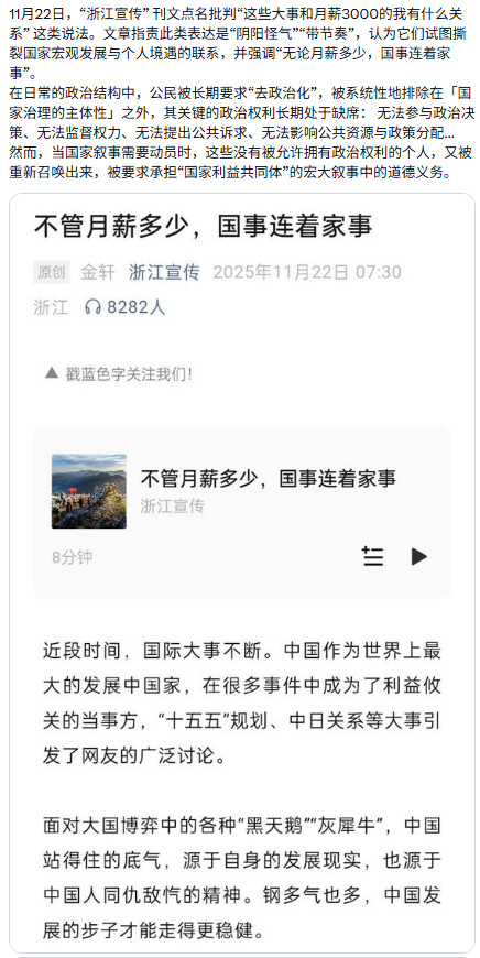 11月22日,“浙江宣传” 刊文点名批判“这些大事和月薪3000的我有什么关系” 这类说法。文章指责此类表达是“阴阳怪气”“带节奏”,认为它们试图撕裂国家宏观发展与个人境遇的联系,并强调“无论月薪多少,国事连着家事”。在日常的政治结构中,中国公民被长期要求“去政治化”,被系统性地排除在「国家治理的主体性」之外,其关键的政治权利长期处于缺席: 无法参与政治决策、无法监督权力、无法提出公共诉求、无法影响公共资源与政策分配…然而,当国家叙事需要动员时,这些没有被允许拥有政治权利的个人,又被重新召唤出来,被要求承担“国家利益共同体”的宏大叙事中的道德义务。