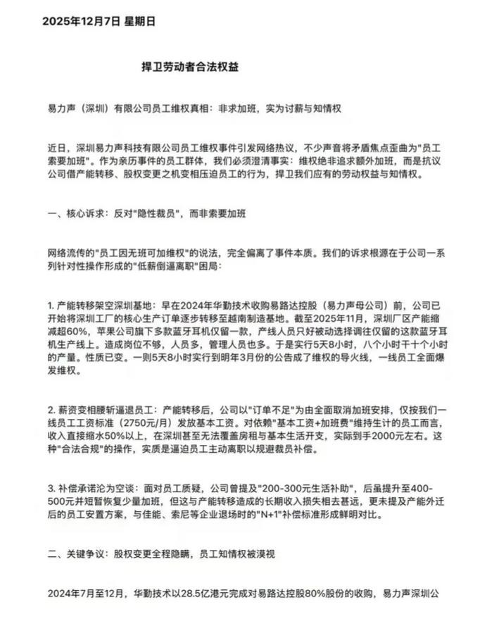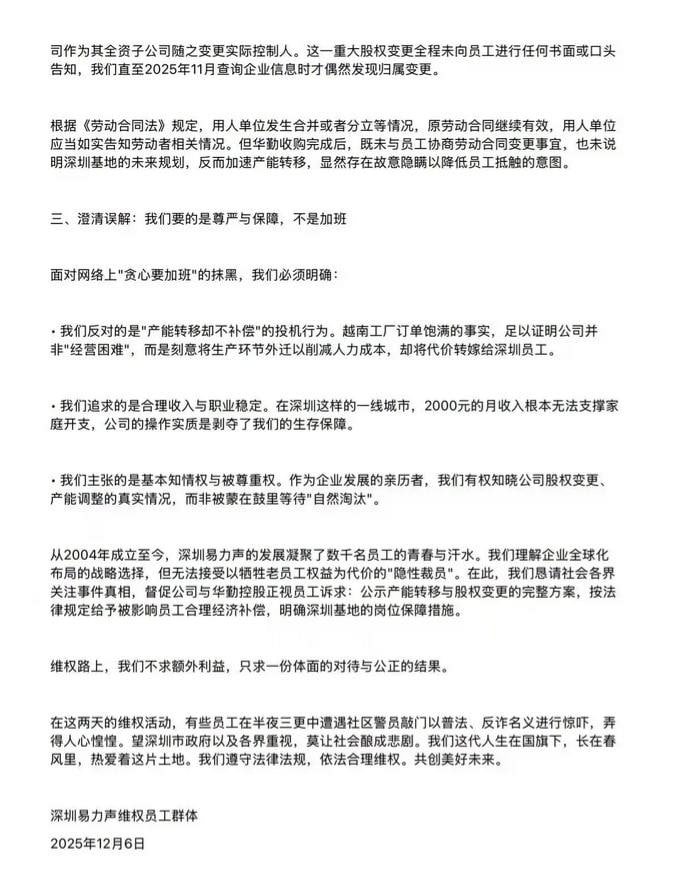在2024年华勤技术收购易路达控股(易力声母公司)前,易力声开始将深圳工厂的核心生产订单逐步转移至越南。到2025年11月,深圳厂区产能缩减超60%,造成工厂岗位不够而人多的情况。工厂于是实行5天8小时工作制,然而却仍然还要工人干10小时产量。同时工厂把工人的工资对半砍,逼迫工人自行离职,承诺的补贴也沦为空谈,只有区区几百块。公司下发公示后罢工全面爆发。在罢工刚开始时,网络上出现了工人罢工为了多加班的谣言,使得许多人表示不解和嘲讽,易力声的工人们就此发表了自己的声明。