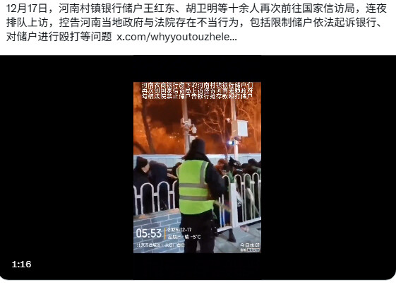 12月17日,河南村镇银行储户王红东、胡卫明等十余人再次前往国家信访局,连夜排队上访,控告河南当地政府与法院存在不当行为,包括限制储户依法起诉银行、对储户进行殴打等问题