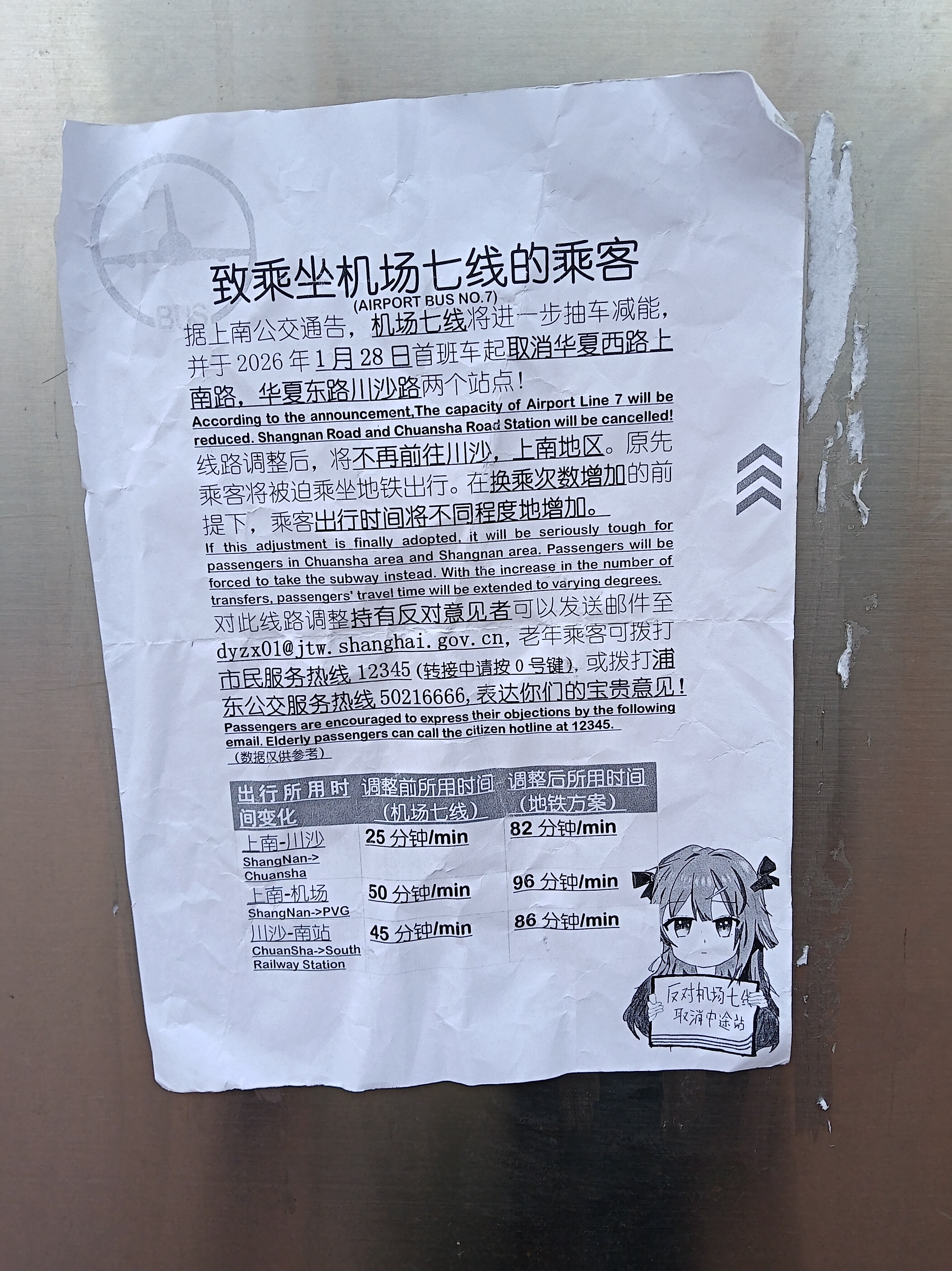 2026年1月27日,上海某公交车迷在路上看到了一张反对机场七线于次日撤销华夏西路上南路、华夏东路川沙路两个中途站点的“大字报”(下图),遂拍照上传动态(几天后惨遭平台删除,可见中修是多么害怕群众的反抗)。