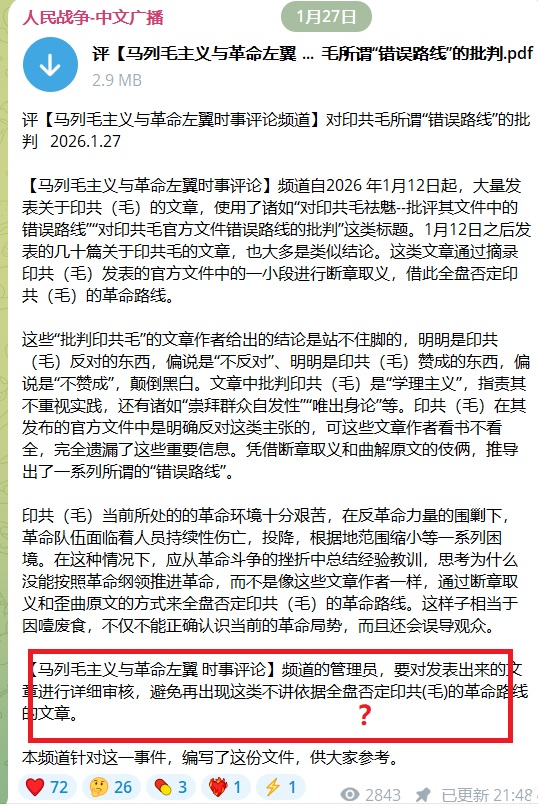 在批判人民战争中文广播这个tg频道之前,我们先复述一遍印共毛如今的问题。印共毛近期多受挫折,出现了中央总书记牺牲,军事作战上的失败,根据地缩小,组织发生局部分裂,人员牺牲,投降,乃至叛变的事件层出不穷地发生。印度革命的形势摇摇欲坠,如果不能扭转这个局势,即使印共毛的党组织没有坍塌覆灭,那离革命的胜利也是遥不可及的。印共毛建党20多年,局势发展到如今这个样子,我们必须要从20多年前的文件上入手,挖掘印共毛同志们所犯的错误并进行同志间的批评指正。印共毛当年合并建党时形成了《印度革命的战略与策略》这份文件,其中出现了不在政治上武装人民群众,不注重党内路线斗争,不重视党内自觉政治力量的培养,以及其他诸如敌我划分的错误和对新民主主义革命路线认识不清的问题。